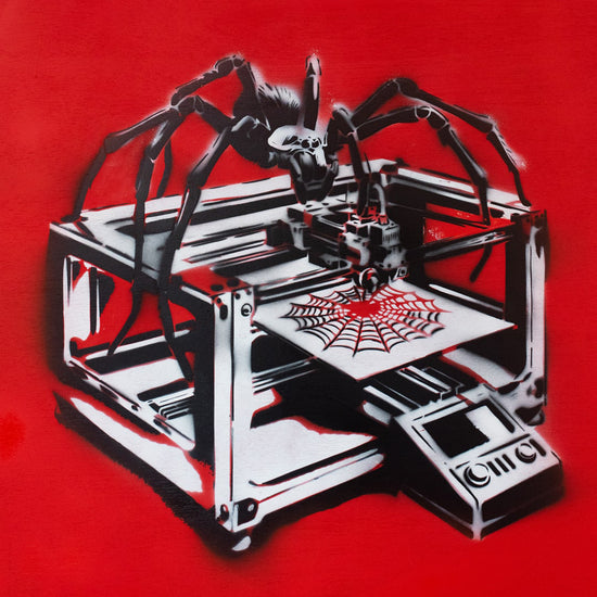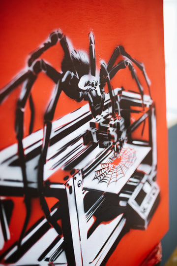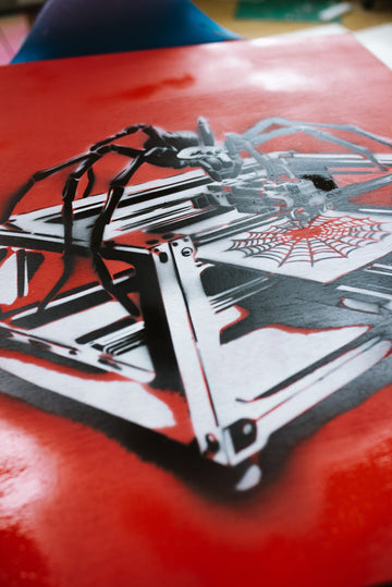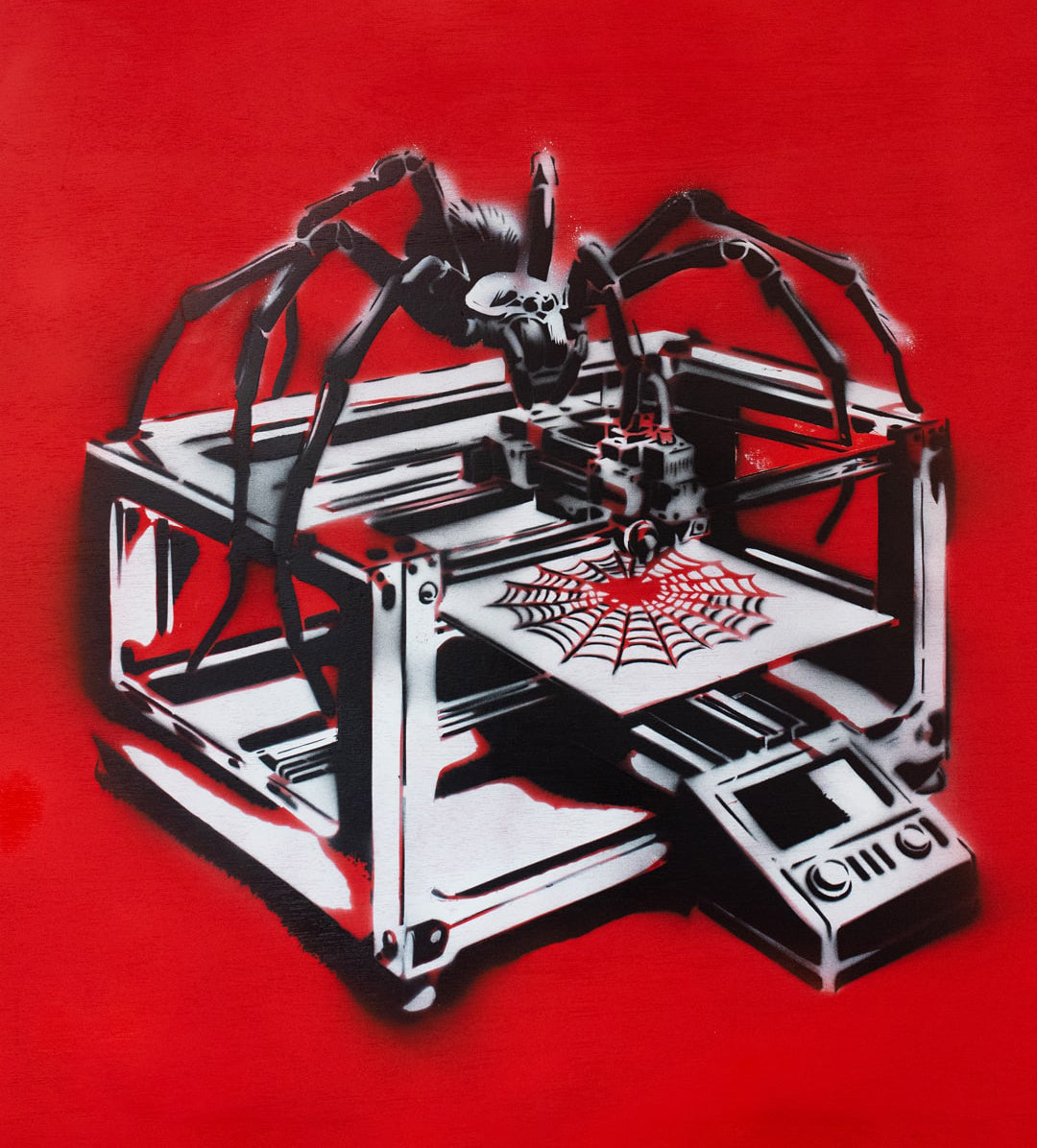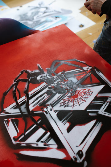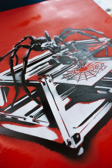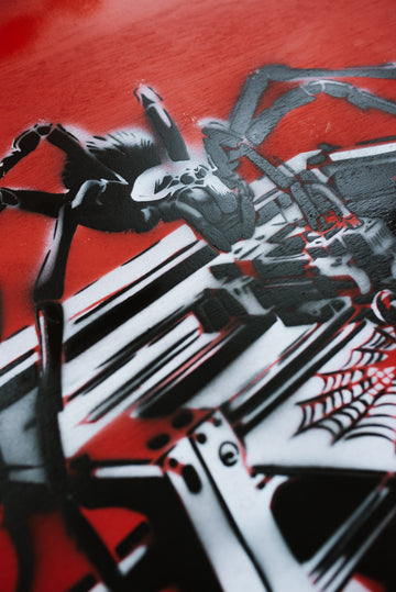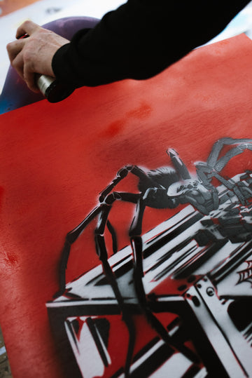 Creating "3D Spinner" was an intricate process that required meticulous attention to detail. Each leg of the spider was cut individually using a different stencil to achieve the layered, realistic effect that defines the piece. The precision involved in this method showcases Zen Xander’s dedication to his craft, as every element of the artwork contributes to its overall impact. The layered stencil work brings depth and dimension, making the spider appear almost lifelike, yet distinctly mechanical.