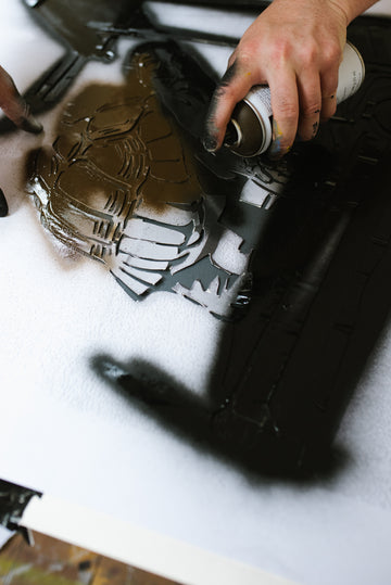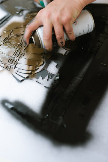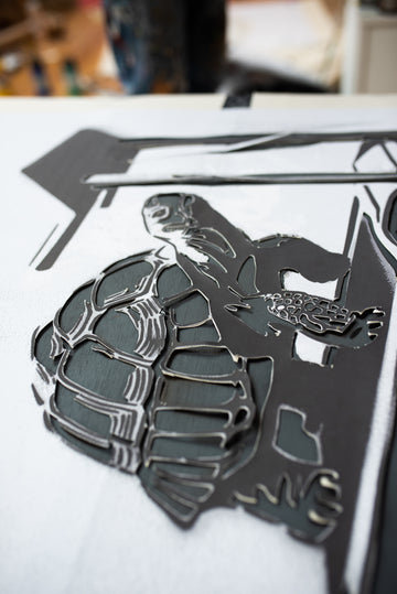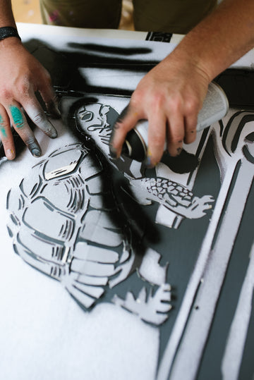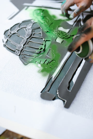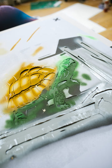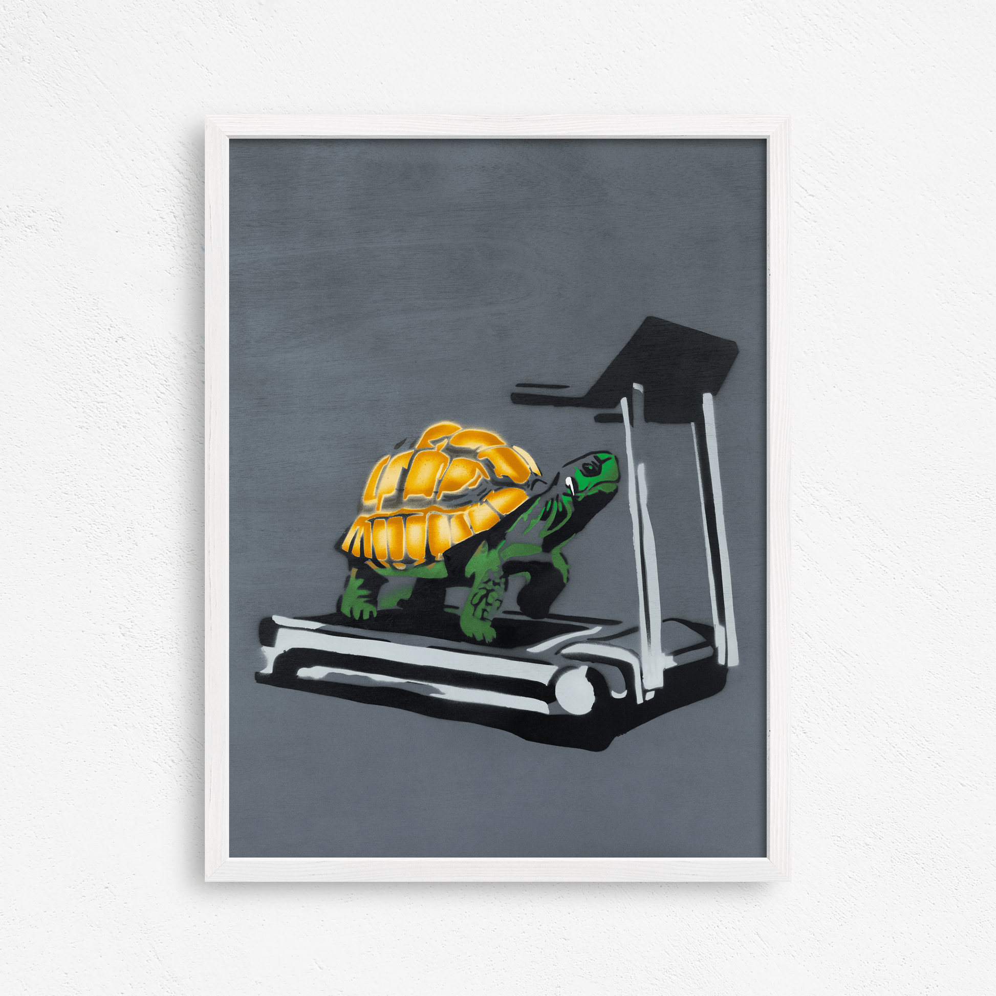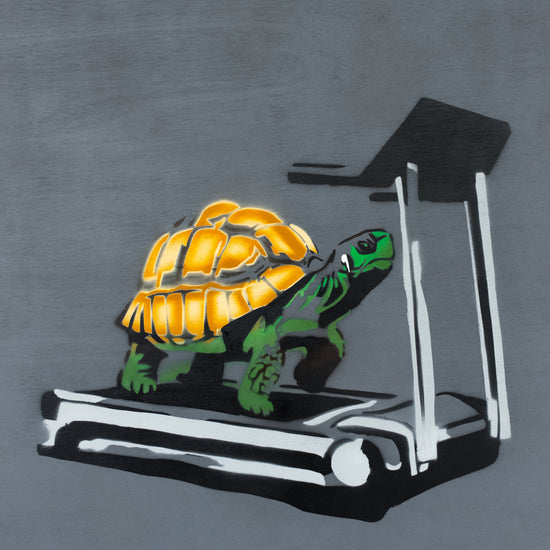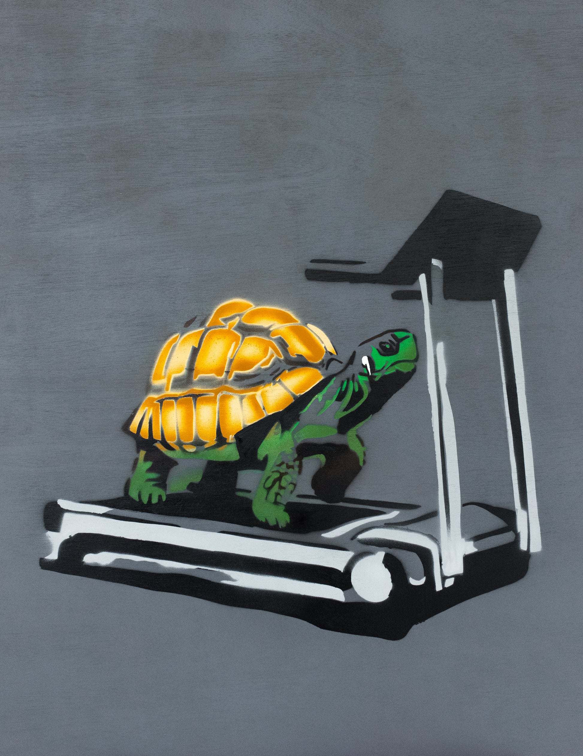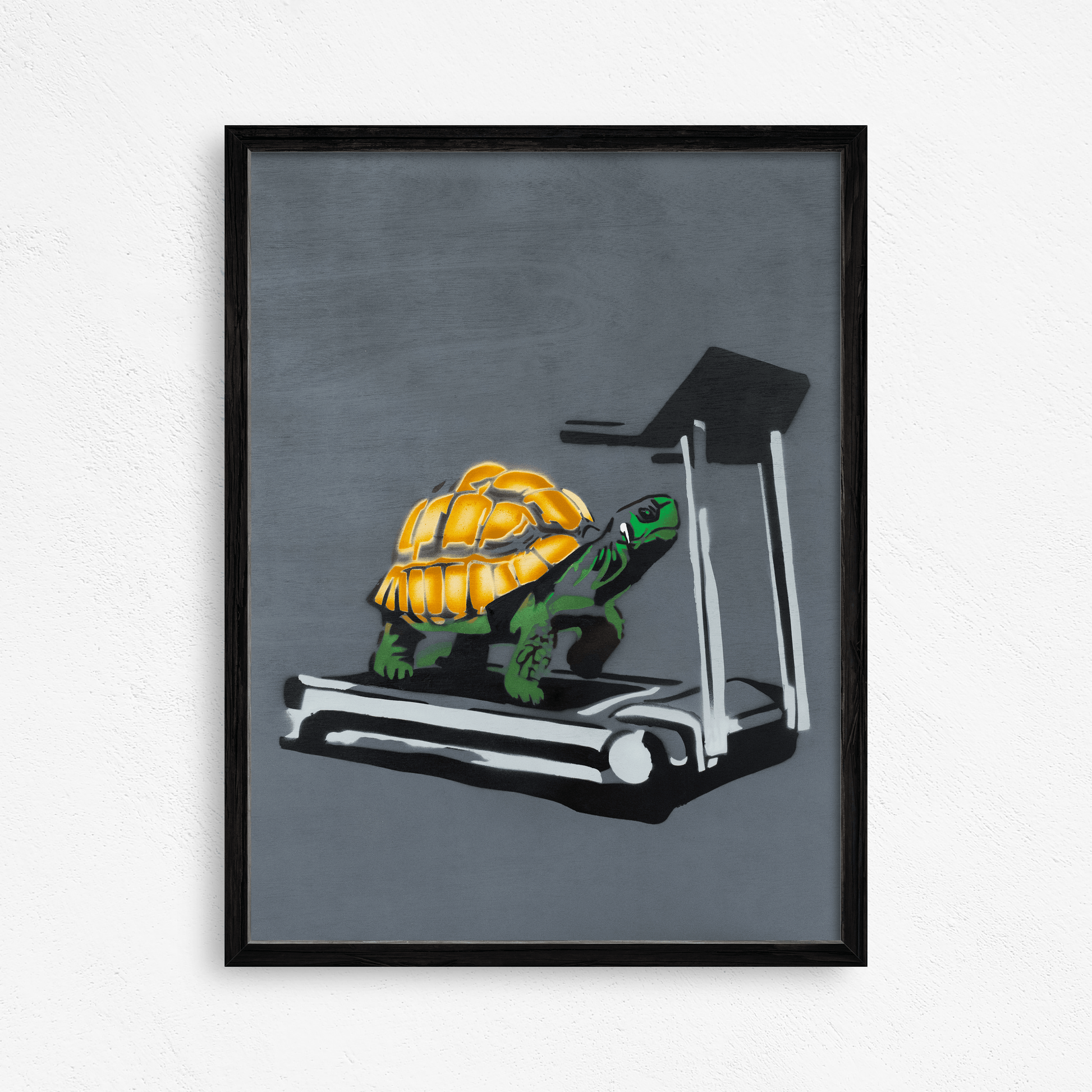 The creation of "PerSHELLnal Best" involved Zen Xander’s signature stencil layering technique, with each element of the tortoise meticulously cut and sprayed to bring out its textured shell and lifelike features. The contrasting gray background and the sharp lines of the treadmill emphasize the tortoise’s journey, making the piece both visually striking and thematically rich.