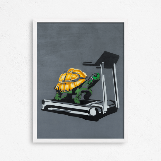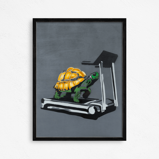 "PerSHELLnal Best" is another clever and thought-provoking piece by Zen Xander, this time focusing on the concept of personal achievement within the fitness industry. In this work, a determined tortoise is seen giving its all on a treadmill, a humorous yet inspiring representation of the idea that even the slowest can achieve their goals with persistence and determination.