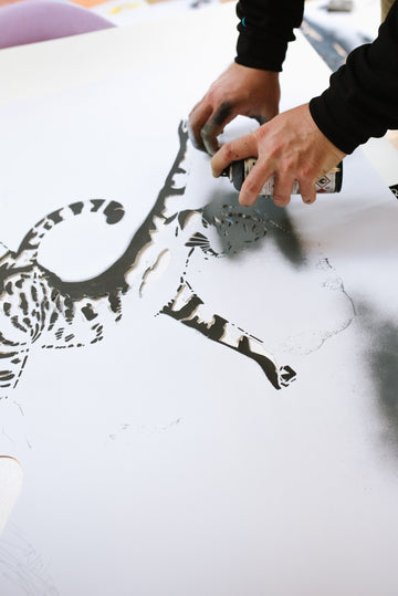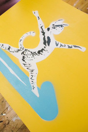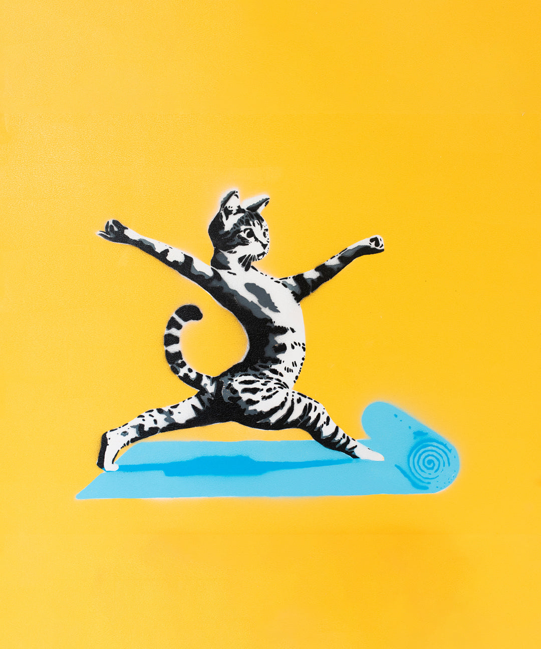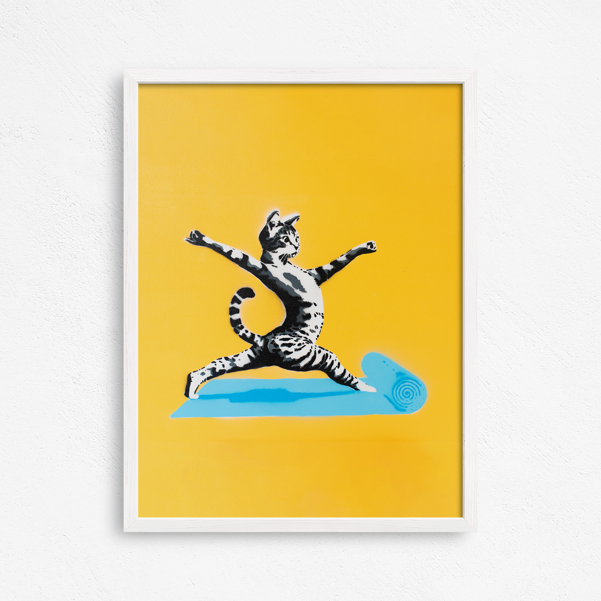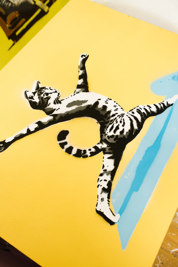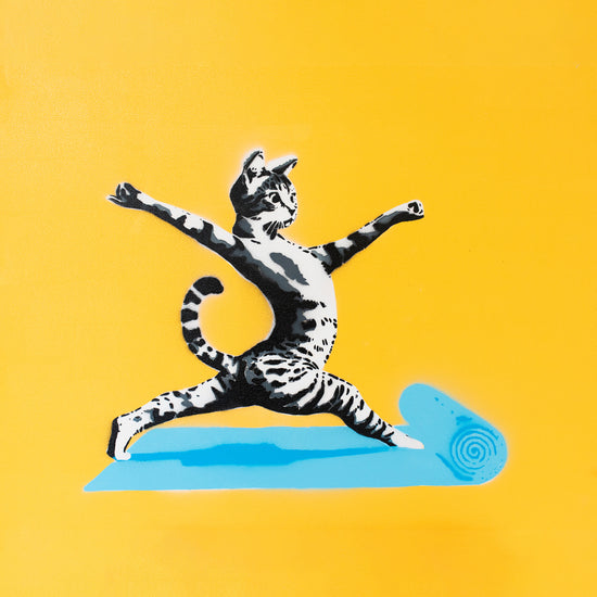 Creating "Yoga Cat" was truly a labor of love for Zen Xander. The meticulous process involved cutting stencils to capture every curve, stripe, and detail of the cat’s form. The layered stencil work required careful attention to ensure that the quality of each element—from the cat’s poised paws to the carefully rolled yoga mat—met Zen Xander’s high standards. The result is a piece that’s not only charming but also showcases the artist’s commitment to detail and craftsmanship.